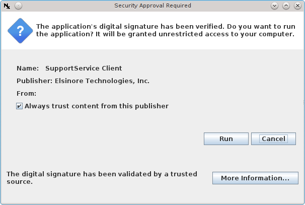 Elsinore Technologies are the authors of Screen Connect and it is therefore OK to trust content from them. Please allow the application to run.